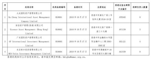 今日,基金业协会发布截止2018年10月17日提供港股投资顾问服务的香港机构基本信息公示,广发国际资产、大成国际资产、安信资产管理(香港)有限公司以及东亚联丰投资管理有限公司4家资管公司成为首批备案的香港机构。
