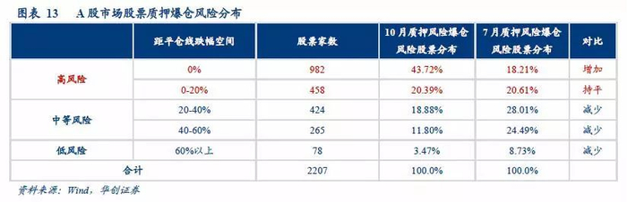 测算方法: 1)股票质押作为企业融入资金,到期还款付息的融资方式,从设立到终止一般为几个月到几年时间不等,为了充分反映全市场的质押风险,选取过去五年发生股票质押记录的A股上市公司,时间维度达5年。2)为了保证未解押质押股票数据的可靠性,剔除已经解押的质押股票。3)爆仓的思路:股价跌多少会平仓,股价的起点就用质押当日的收盘价做基准。4)将触及目前股票价格触及平仓线及距平仓线跌幅在0-20%区间的个股划分为高爆仓风险,距平仓线20-40%的划为中等偏高风险、40-60%的划为中等偏低风险,距平仓线60%以上的划为低爆仓风险。