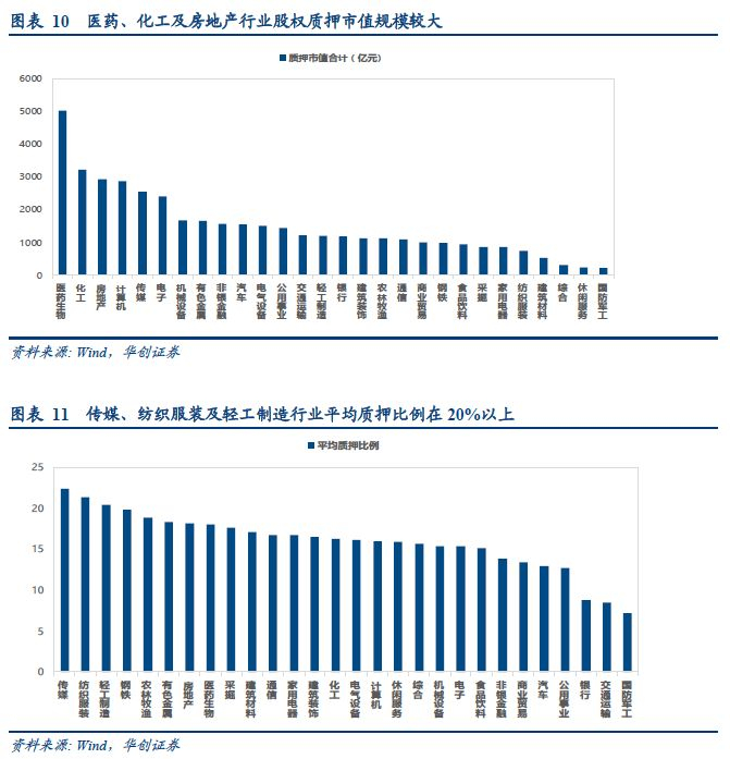 医药、化工及房地产行业是质押规模较大的行业,对应质押规模(以10/16 收盘价计算)分别为5009 亿元、3214亿元及2933亿元。而传媒、纺织服装及轻工制造行业的平均质押比例均在20%以上,分别为22.39%、21.38%及20.41%;对应质押股份数量排名前三的行业为房地产(556亿股)、化工(482亿股)及医药(465亿股)。结合质押比例及规模综合来看,当前国防军工、银行及食品饮料行业的质押解押压力较小。