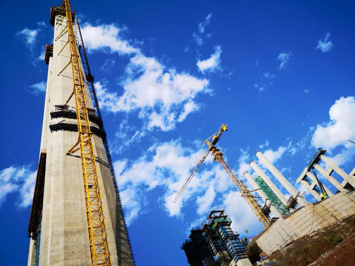 此次封顶的主塔为大桥华坪岸左幅塔柱,塔高228米(含塔冠),为钢筋混凝土门式框架结构,塔顶距金沙江江面垂直高度479米,接近160层楼的高度。自2018年2月浇筑首节主塔混凝土以来,150名建设者,历时200余天,克服了交通条件差、气候条件多变、玄武岩机制砂混凝土高泵送难等诸多困难完成主塔封顶。