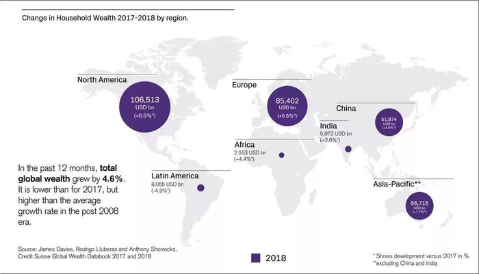 在这份报告中,截至2018年中期的12个月内,全球总财富增加了14万亿美元,达到317万亿美元,增长率约为4.6%。