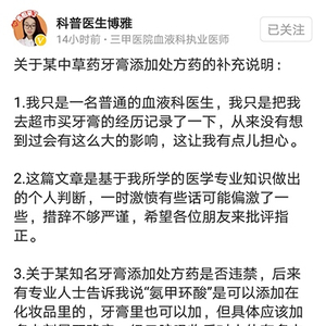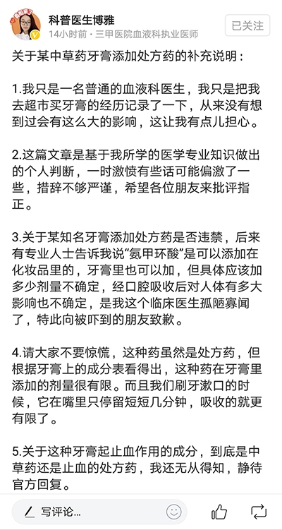 10月22日凌晨,博雅又发表了一篇《关于某中草药牙膏添加处方药的补充说明》。博雅表示,“关于某知名牙膏添加处方药是否违禁,后来有专业人士告诉我说‘氨甲环酸’是可以添加在化妆品里的,牙膏里也可以加,但具体应该加多少剂量不确定,经口腔吸收后对人体有多大影响也不确定,是我这个临床医生孤陋寡闻了,特此向被吓到的朋友致歉。”