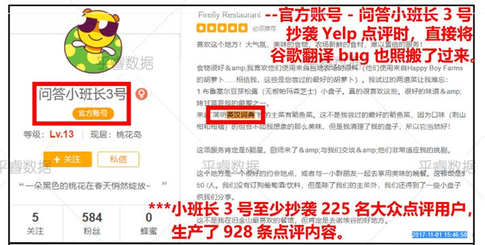 部分账号抄袭Yelp上的评论时调用了谷歌翻译,并将翻译错误一并搬运;