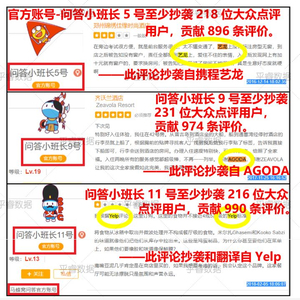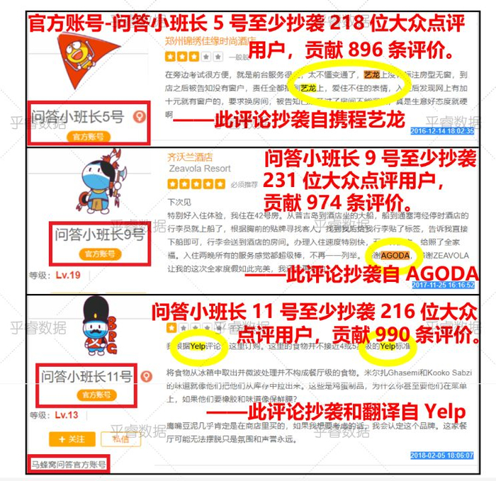 10月20日晚间,“小声比比”发布上述文章,称乎睿数据抓取了马蜂窝上116万家餐厅,并抽取了三分之一的样本进行对比分析,最终在马蜂窝上发现了7454个抄袭账号,平均每个账号从携程、艺龙、美团、Agoda、Yelp上抄袭搬运了数千条点评,合计抄袭了572万条餐饮点评,1221万条酒店点评,占到马蜂窝官网声称总点评数的85%。