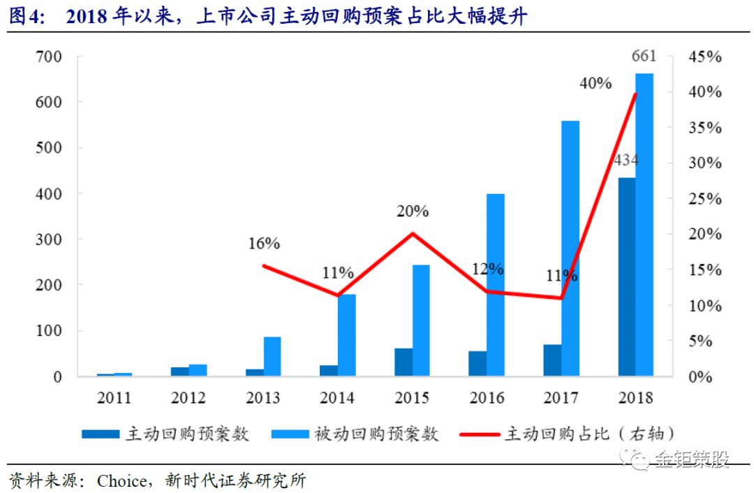 值得注意的是,2018年全部股份回购预案中,上市公司主动回购占比大幅提升。根据choice统计口径,我国上市公司股票回购可分为股权激励回购和普通回购。前者主要是对离职股权激励对象持有的激励股票回购注销,属于被动回购;后者属于上市公司主动回购,相较前者更能彰显公司信心。从上市公司历史发布的回购预案来看,大都以被动回购为主,而主动回购相对较少:2011-2017年,上市公司发布股份回购预案1748笔,其中主动回购248笔,被动回购1500笔,主动回购占比仅为14%;但2018年以来,上市公司主动回购出现明显增加,年初至今(截至10月24日)发布的1095笔回购预案公告中,主动回购达到434笔,超过2011年-2017年的总和,在全部回购预案中的占比也已大幅提升至40%。