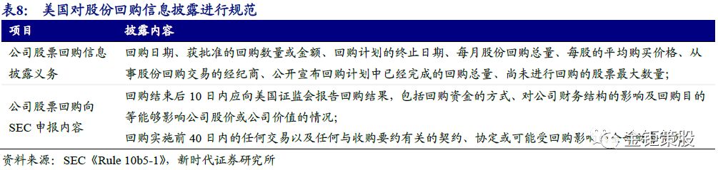 未雨绸缪规范信息披露,防范库存股回购出现内幕交易。2000年SEC制定Rule 10b5-1规则,允许公司利用预先制定好的回购计划实施股份回购,避免被认为是内幕交易。但由于实际情况中,公司往往不按照公告计划进行回购,甚至根本不进行回购,造成诸多问题。2003年,SEC对该规则进行了修改,增加公司股票回购的披露义务,要求上市公司以标准化文本对回购日期、数量、平均购买价格、经纪商和已完成、未完成回购总量等诸多细节信息进行严格披露。此外,公司在回购实施前40日内的任何交易和可能受回购影响的全部财务情况、结束后10日内关于回购结果和其他与回购有关的信息也都要申报。该规定对“安全港”规则进行了完善,对美国公司股份回购的信息披露进行了规范,起到了防范内幕交易的作用。