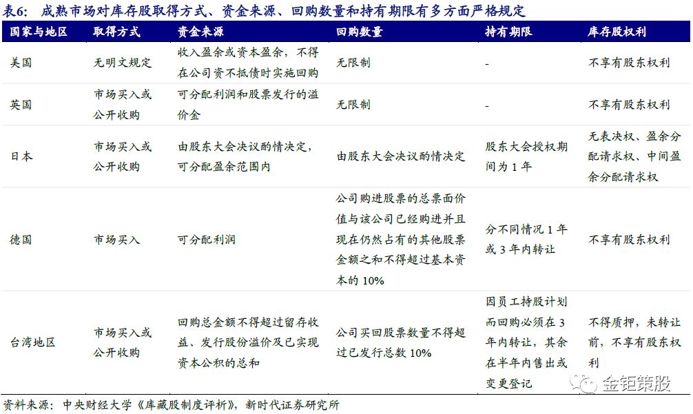 从海外成熟市场对库存股回购的规定细则来看,美国与德国较有代表性,美国库存股制度重视实用性,对企业限制较少;德国库存股制度更为严格,对防范内幕交易与信息披露等方面作了较多规定。