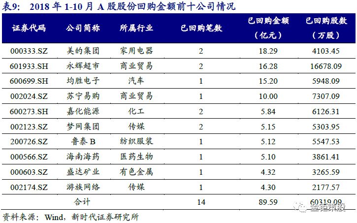 自2011年以来,A股主要有三次比较大的回购潮,分别是2012年10月至2013年6月,发生公司回购91笔、总规模273.9亿元;2015年8月至2016年6月,公司回购363笔、总规模174.8亿元;以及2017年10月至今的最大回购潮,截至2018年10月23日,已回购笔数达到1385笔,总规模达到651.1亿元。具体公司方面,2018年以来股份回购金额前三的公司为美的集团、永辉超市和均胜电子,已回购金额分别达到18.29亿元、16.28亿元和15.20亿元。单月来看,仅2018年10月1日至23日,上市公司就发布回购预案74家,已回购笔数达到180笔,回购金额达到112.3亿元。我们认为,随着库存股制度的建立,上市公司股份回购将掀起新的浪潮,而回购在稳定股价、融资并购等中的作用也将更加显现。