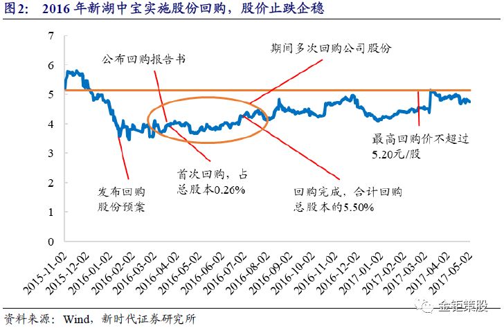 2016年3月25日~6月27日,新湖中宝前后进行了7笔回购,累计回购股份数量为 500,326,892 股,占公司总股本的比例为5.50%。公司回购股票最高价为4.26元/股,最低价为3.71元/股,支付的总金额为19.67亿元。从公司发布回购预案到回购实施完毕,公司股价稳步提升,回购完成后较长一段时间,股价也表现较好。这反映了大比例回购对二级市场股价有较强的提振作用。
