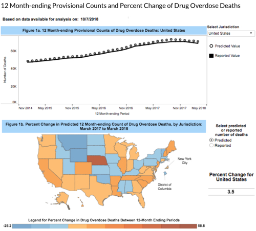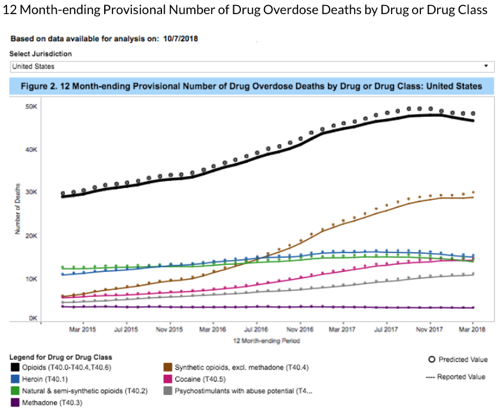过去38年里,美国吸毒过量死亡人数呈几何级数增长,几乎每年增加9%,大约每8年翻一倍,2017年致死72000人。除中北部几州外,美国全境都曾是毒品的重灾区。