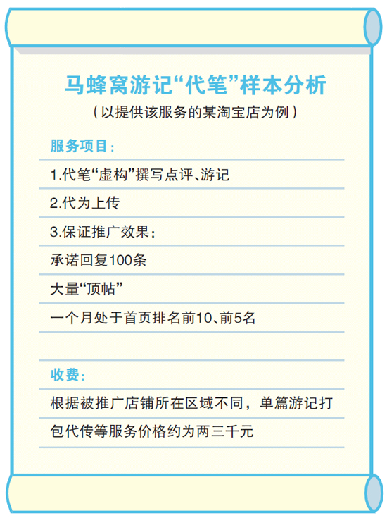 对于马蜂窝游记相关服务,有代笔网店客服向北京商报记者表示,写手可以不前往目的地和被推广的商家,仅凭客户给的资料和照片撰写“原创”的游记、点评,而且世界各地游记都可以接单,收费根据不同区域有所不同,比如此前被曝在马蜂窝上存大量营销水军刷好评的三亚地区收费就相对较高,一篇游记加代发等相关服务在3500元,而北京等地标价则为2000元左右,“现在马蜂窝三亚目的地首页很多都是代笔操作的游记”。该客服称。