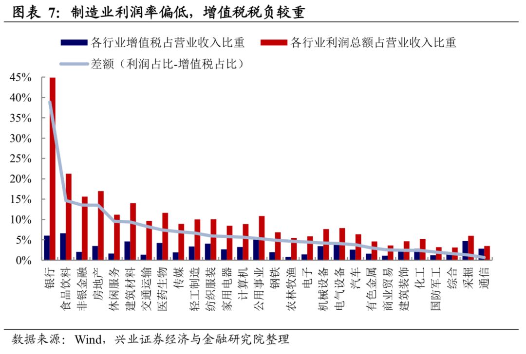 从另外一个维度上,我们对比各行业增值税占营业收入比重和各行业利润总额占营业收入的比重之差来观察各行业税负程度。如下图所示,通信行业利润占比与增值税占比之差最小,银行和食品饮料行业具有最高的利润占比,但是增值税占比相对较低。因此从行业利润率层面来看,中国增值税税负较重的行业主要体现在制造业上。制造业是增值税减税的主攻方向。