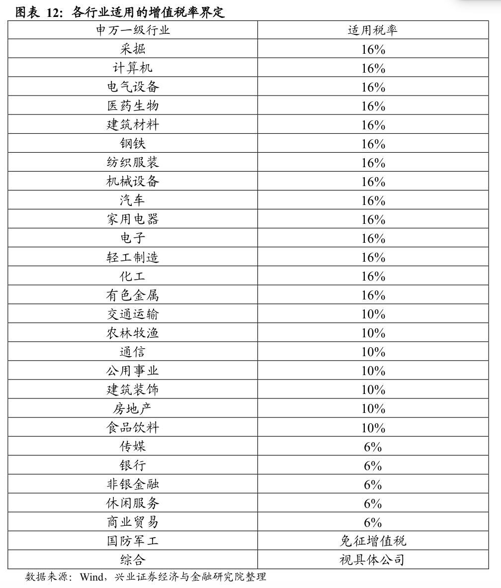 根据上文的分析,我们认为增值税三档并两档存在降低16%和降低10%两种情况,6%有较大概率不会有改动。为便于展开情景分析,我们将后续三档税将如下变化: