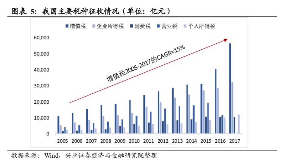 继1991年以来四次改革后,增值税逐渐成为我国第一大税种,2017年我国公共财政收入中税收收入14.4万亿,增值税5.6万亿,占比接近40%,05年以来该项税收的复合增速高达15%。