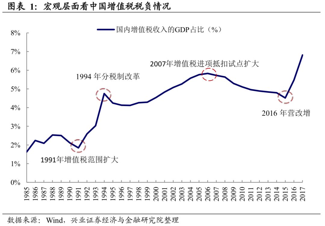 2016年5月1日起,全国范围内全面推开营业税改征增值税(以下称“营改增”)试点,建筑业、房地产业、金融业、生活服务业等全部营业税纳税人,纳入试点范围,由缴纳营业税改为缴纳增值税。增值税税基扩大,增值税收入在GDP占比再次快速提升,从5%上升到2017年的7%。
