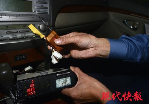 神不知鬼不觉让乘客花了冤枉钱的 “跑得快”是如何工作的?现代快报记者乘上了被查处的出租车,做了手脚的计价器从外表上看不出什么异样,随后执法人员把计价器抽了出来,记者看到了一个带着两个插头的导线,就是 “跑得快”。