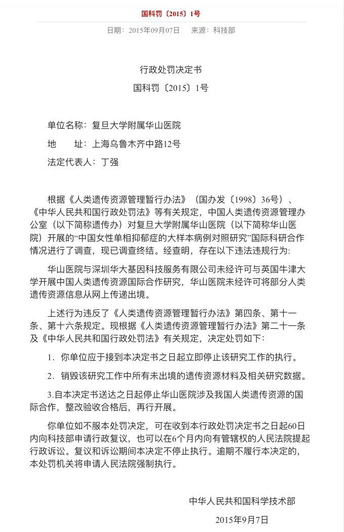 最后两起处罚则是关于复旦大学附属华山医院曾开展的“中国女性单相抑郁症的大样本病例对照研究”国际科研合作。