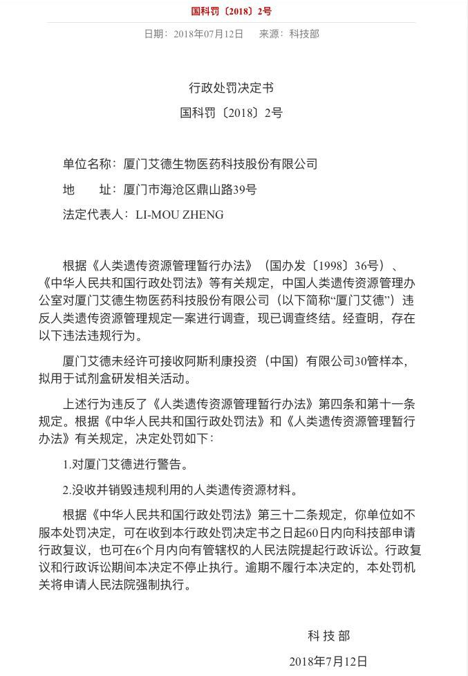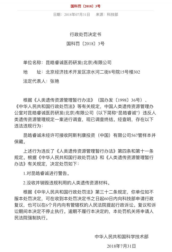 罚单显示,经中国人类遗传资源管理办公室调查: