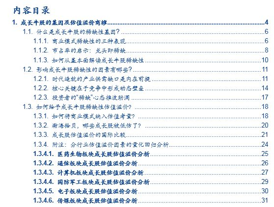 正文1、成长牛股的基因及估值溢价商榷“资源稀缺并不可怕,就是怕有稀缺心态”,行为经济学家穆来纳森和认知心理学家沙菲尔在著作《稀缺:我们是如何陷入贫穷与忙碌的》中如是说到。这句话放在A股上,或得改改,资源稀缺与稀缺心态两者均有,但哪个更重要则见仁见智。回望A股市场二十多载历史,总有一批股票在资源稀缺和稀缺心态的共同作用下以惊人的涨幅为市场留下深刻的印记,被众人冠之以“牛股”。而牛股的稀缺性更使得后来者孜孜不倦地追求和探索。虽然,这些寥若星晨的牛股诞生都离不开天时、地利、人和等因素的叠加,但爆发看似偶然,其实背后存在着必然的推动力。