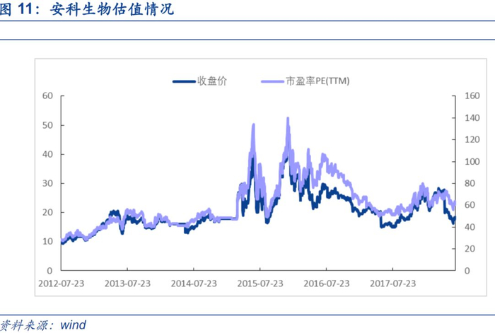 以安科生物(300009)为例,公司是国内最早的基因工程研发企业之一,多年以来高度公司高度重视产品研发,研发投入持续保持快速增长,2016 年研发费用接近 0.8 亿,占营业收入的比重达到 9.2%,远高于行业平均不到 5%的研发费率。公司技术人员的数量也持续增长,2016 年达 306 人,占公司总员工的比例接近 20%。持续的高强度研发投入为公司带来了丰厚的成果,成功研发了生长激素粉针、重组人干扰素等产品。在研产品中,已有生长激素水针进入报产阶段,长效生长激素等多种产品进入 III 期临床,形成了丰富的产品梯队。值得注意的是,生长激素市场目前有市场主要由安科生物(29%)、联合赛尔(42.7%)、LG(15.8%)和金赛药业(8.6%)四家企业占据,国内A股市场仅有金赛药业的母公司长春高新一个竞争对手,具有相对稀缺溢价,随着公司临床试验的通过以及市场对于生长激素需求的提升,公司的估值从2015年9月初的48.84快速提升至2015年底的139.74,可见投资者对于其稀缺性的认可。