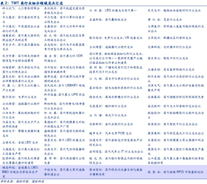 龙头即稀缺,成长牛股稀缺性体现在所谓的“显性冠军”和“隐形冠军”。隐形冠军是由赫尔曼·西蒙在其著作《隐形冠军》中提出,所谓“隐形”是指在全球范围内这些企业并非众所周知,主要由于企业规模相对较小;“冠军”是指这些企业占有着较高的市场份额,有着独特的竞争策略,往往在某一个细分的市场中进行着专心致志的耕耘。显然,所谓“显性冠军”和“隐形冠军”也就是行业及细分领域的龙头。换句话说,龙头就是稀缺。目前,A股大多数成长牛股均处于隐形冠军阶段,例如人工智能龙头科大讯飞、国内基因测序龙头华大基因、国内领先的精密光电薄膜元器件制造商欧菲科技等,还有少数正逐渐从隐形冠军走向显性冠军,例如国内最大安防视频监控龙头海康威视等、国内显示器面板龙头京东方A等。从行业层面来看,新经济领域行业集中度并不高,国防军工(以营业收入衡量CR4为34.77%)、计算机(29.16%)、医药生物(23.03%)、传媒(22.53%)等均属于分散竞争型,且市场占有率超过5%的股票均不超过8个,市占率不断提高的企业也是少之又少。以计算机行业为例,市占率超过5%的企业只有四家,紫光股份(0.09)、航天信息(0.07)、同方股份(0.06)、浪潮股份(0.06),市占率连续三年提高的有紫光股份、浪潮信息、中科曙光、科大讯飞和新大陆,近10年区间涨幅分别为422.62%、1415.31%、1269.20%、615.28%和249.66%,领先多数同行业股票。相比美国来看,近年来TMT类行业集中度(CR4)均维持在50%左右,因此从长期来看,国内大多数成长型行业集中度将进一步提升,催生出更多的牛股。