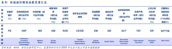 考虑到具有超越行业固有商业模式并形成独特的核心竞争力是估值稀缺性的根基,所以我们先将市盈率及其他研究指标的行业平均值求出,计算出具体股票各个指标与行业平均的相减差距。同时,通过多元线性回归对各个影响因子与以市盈率同行差额为指标的估值溢价进行量化建模,从而发现其影响力大小。
