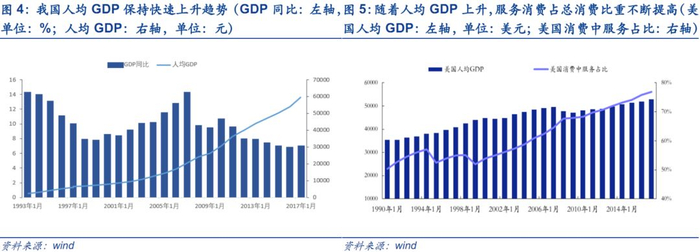 随着中国老龄化的加速到来预示着中国未来储蓄率将下降,消费率将上升。同时,作为世界第二经济体,虽然面临经济结构转型的阵痛,我国经济总量仍保持着较快的增长,经济总量迅速增长使得人们收入得到了切实的提高。1980年以来,我国人均GDP的增速基本都在6%以上,2017年人均GDP已超过5万元,而城镇家庭的人均可支配收入也达到了3.2万元(约合4900美元)。人们的收入尤其是可支配收入的提高使得消费升级的潜力在不断提升。根据马斯洛需求模型,人们在实现了较低需求之后会转而追求更高层次的需求。比照美国、日本等国的经验来看,随着人均收入的快速提升,会带来发展型、享受型消费比重明显上升,消费内含的附加值提升,消费需求差异化加大。在“消费升级”背景下,消费类成长股若要具备稀缺性不仅限于满足基本的“衣食住行”需求,更主要在于满足多元化的品质需求,主要体现在两点:一是对于物质产品更为严格的要求,内容是其生存之道;二是对于产品背后带来的情感价值的期待。