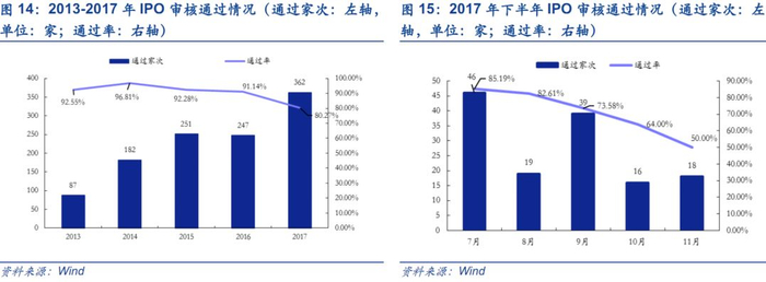 我们以IPO政策和独角兽回归为例来说明市场环境的变化如何影响成长牛股的稀缺性。我们关注到2017年IPO审核通过率较往年显著下跌,从下半年至今IPO审核持续趋紧,2018年上半年两市首发企业IPO通过率仅略超五成(51.79%),远低于2013年以来平均84.96%的审核通过率,使得场内TMT类成长股公司稀缺性更加突出。同时,未来海外科技股出现回归潮与大批独角兽粉墨登场也会降低成长牛股稀缺性,例如三六零、工业富联、宁德时代等登陆A股也将使得场内优质成长型公司得到有益扩充。
