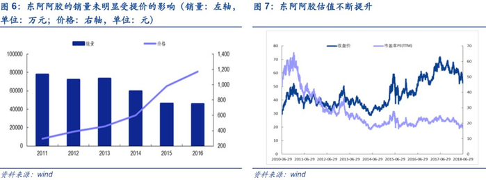以东阿阿胶为例,其主营产品阿胶作为一款滋补中药,其产量受制于核心资源驴皮的供应。公司通过鼓励农户散养、自建养殖基地和海外进口驴皮的方式,首先保障上游原料的供应,并且通过文化营销和价值回归的方式,一方面结合《神农本草经》将阿胶定位为“滋补上品”,向消费者传递滋补养生的理念,从而开创相关的养生消费人群。另一方面采取大幅提价的战略,出“九朝贡胶”等高端产品,促进产品价值的回归,塑造消费者心目中高端补品的形象。供给有限加上公司长期对于品牌价值不断推广,市场对于品牌的知名度和认可度不断提升,逐步占据市场主要份额(另一竞争对手福胶为非上市公司)。我们认为,正是这种上游资源把控能力以及独到的品牌价值使得市场能够逐步认识到其稀缺价值,估值从2014年的最低15.84回升至21左右。