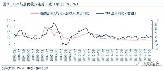 回到国内,人均可支配收入增速与CPI增速走势存在较高的一致性。在2003年、2007年和2010年,城镇居民人均可支配收入有明显上行,这些时期CPI与PPI走势高度一致并均有上涨。但是回顾2016年以来的情况,城镇居民人均可支配收入并没有长足的增长,与之相对应的是社会消费增速的疲弱,PPI与CPI也持续分化。