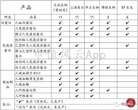 风云君从红塔证券研究报告中找到上市公司生产销售产品种类统计的图表,这里缺少美股上市公司泰邦生物的数据。