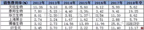 2017年-2018年除天坛生物外,其余上市公司销售费用上涨比较明显,尤其是泰邦生物、博雅生物和华兰生物这三家公司。