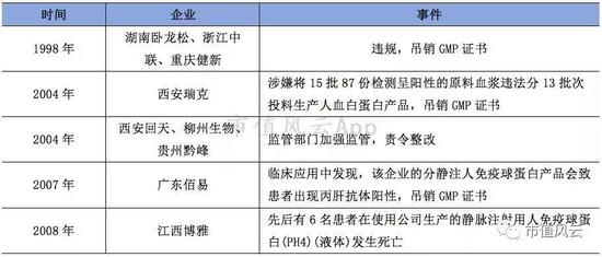 只要安全性出现问题的血制品企业,就会被处罚甚至吊销GMP证书,比如湖南卧龙松、浙江中联、重庆健新、新疆豪斯达、西安瑞克、广东佰易等企业因违法等不良行为而出局。