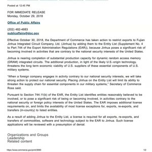 美国时间10月29日,美国商务部发布公告称“将福建晋华集成电路有限公司加入实体清单”,对福建晋华采取限制出口措施。美国商务部称,“福建晋华即将完成DRAM的量产,该技术可能源自美国,且将威胁到为美国军方提供此类芯片的供应商的生存。”