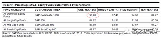 标普道琼斯指数公司每半年会发布《SPIVA报告》,其中有专门的篇幅定期回顾美国共同基金表现,每期结果表现都非常稳定,一句话概括——约九成的共同基金无论短中长期都持续稳定地跑输业绩基准。(相比之下中国的基金经理现在仍然是很幸福的,但是留给我们的时间还有多少呢?)