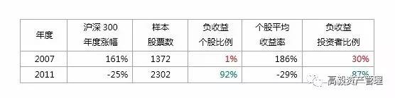 可以从公开渠道查到两个具备代表性的官方可信统计,第一个是在大牛市的2007年,上交所披露当年个人投资者的亏损比例达到30%;第二个是在小熊市的2011年,政协会议披露当年个人投资者的亏损比例达到87%,人均亏损4万元。以下表格的列示可能更有画面感: