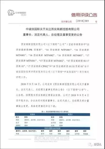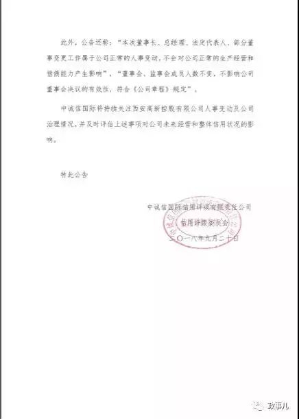 值得注意的是,西安高新控股有限公司上述公告发布后,中诚信国际信用评级有限责任公司也于9月20日发布了《关于关注西安高新控股有限公司董事长、法定代表人、总经理及董事变更的公告》。