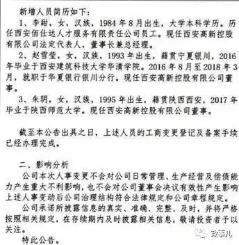 另据北京时间11月2日报道,银行间市场清算所股份有限公司(上海清算所)官网上,《西安高新控股有限公司关于董事长、总经理及董事发生变动的公告》中3名新增董事的简历已被删除,仅剩姓名。