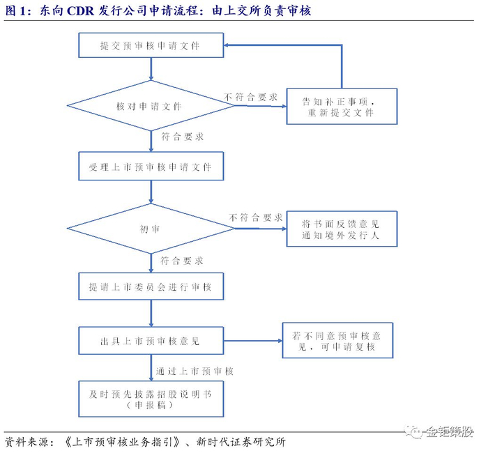 东向CDR初始生成期不能兑回,达到要求后由上交所负责预审核。东向CDR发行包括初始生成期、上市申请期和上市三大阶段,跨境转换机构进行东向CDR初始生成,根据《上市交易暂行办法》,初始生成期间产生的CDR将不予办理CDR兑回业务,初始生成达到上市要求后,将由公司发起上市申请,由上交所进行预审核业务。与公开征求意见稿一致,《上市预审核业务指引》明确上交所将担任对东向CDR发行公司的审核角色,具体流程包括申请文件核对、申请文件受理、初审、上交所上市委员会审核以及预披露等环节,最终由证监会进行申请的核准。