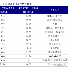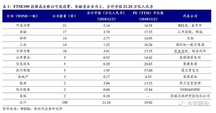 沪伦通初期,东向CDR发行公司将是伦交所优质上市公司,有较大可能来自富时100(FTSE100)成分股,当前富时100成分股合计市值21.24万亿人民币,其中,市值体量第一的荷兰皇家壳牌市值占比超过FTSE指数合计市值的13%。从行业分布来看,可选消费、金融类企业是富时100指数的主要成分,数量占比约四成。