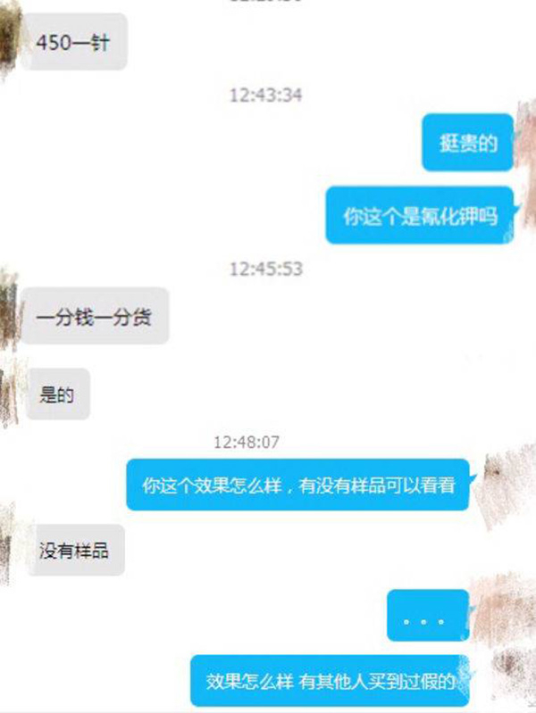 随后,记者随机添加了另一卖家的联系方式,并得到了“毒针”“麻醉针”的报价。“毒针”和麻醉针都是450元一支,一支可毒4—5只大型犬。”他说,“毒针”原料是氰化钾,下单就可发货,即使货物有些敏感,但走物流发,不会被查。
