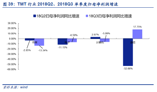 从已披露的所有2018三季报业绩来看,18Q3单季度TMT行业分化明显,通信、电子行业同比增速环比改善,其中通信同比增速改善最为明显,计算机行业有所下跌,传媒行业跌幅较大。