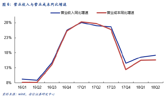 从利润表的角度来看,营业成本下滑使得ROE上升。全A(非金融两油)的营业收入和营业成本从16Q1至16Q4的变动趋势及幅度基本一致,从17年开始两者均大幅下降,但是变动幅度出现分化,营业成本波动更大。营业收入同比增速从17Q1的28.05%逐步下滑至17Q4的14.55%,随后小幅上涨至17.20%;营业成本同比增速则从17Q1的28.27%大幅下滑至17Q4的12.44%,随后上涨至18Q2的15.61%,变动幅度大于营业收入,造成了毛利率的上升,进而使得ROE上升。