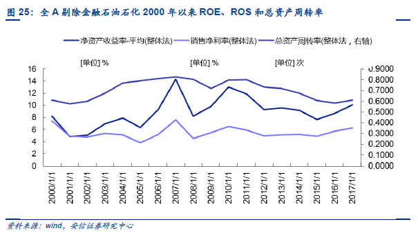 就中短期来看,未来很有可能出现总资产周转率和ROS共同下滑的局面。销售收入将成为双刃剑,即在其他条件都不变的情况下,提高销售收入在拉低销售净利率的同时也会抬升总资产周转率,两者对于 ROE 的作用相反,对冲后将使得 ROE 最终变动存在一定的变数,例如在 2001-2002 年、2004-2005 年、2010-2011 年期间销售净利率和总资产周转率的走势出现此消彼长的局面。其中,在2001-2002 年、2004-2005 年期间 ROE的上涨主要来自于总资产周转率的支撑。同时,2005-2007年、2009-2010年、2015-2017年则出现ROS和总资产周转率同时上涨共同推动ROE提升,期间ROS的作用会相对更大一些。结合历史宏观经济形势观察,在经济形势向好的阶段(繁荣和复苏)时期,ROS和总资产周转率才有可能同时提升。而在ROE的下滑周期,通常总资产周转率和ROS会出现共同下滑的局面,例如2013-2014年、2008-2009年、2000-2001年。