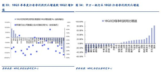 从环比视角来看,Q3盈利贡献主要来自于银行、石油石化、地产;下滑主要来自上游周期、部分必需消费以及部分成长行业。具体而言,上游周期除采掘外大多出现环比下滑,有色下滑较为明显;中游制造业大多数出现下滑,盈利亮点主要集中在建筑材料和机械设备;下游消费领域全面出现下滑,此前盈利维持高位增长的休闲服务、食品饮料均有所下降。金融方面,18Q3单季度银行行业环比改善,非银金融行业下滑明显。TMT领域,18Q3单季度TMT行业分化明显,通信、电子行业同比增速环比改善,军工、传媒行业有所下滑。