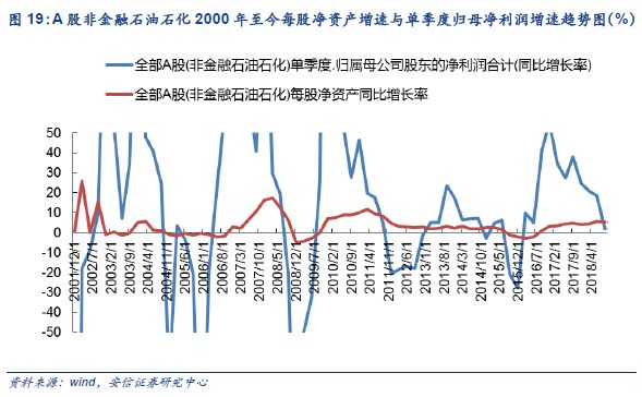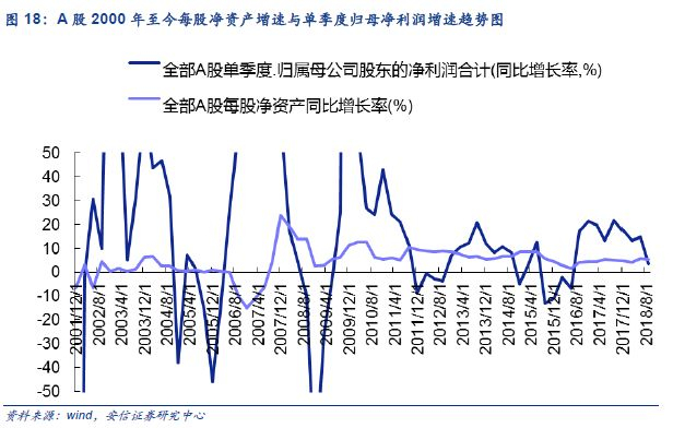 这点我们可以从2000年至今每股净资产增速与单季度归母净利润增速趋势图清楚地得到验证。在03-04、06-07年、10-11年、13-14年、16-17年,ROE在持续上升时,净利润增长率均高于净资产增加比例。