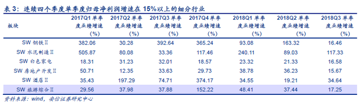 在稳定增长领域,我们将连续四个季度单季度归母净利润增速在15%以上的细分行业分为以下三个大类:1、受益与供给侧改革的细分领域,例如水泥制造、钢铁等;2、受益于消费升级的细分领域,比如酒店、旅游综合等;3、房地产链,例如房地产开发和白色家电。