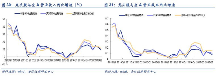 Q3营业收入放缓是全A非金融石油石化盈利下滑的主要原因。全A非金融两油的营业收入增速下降幅度也高于营业成本下降幅度,分别从18Q2的13.61%和15.61%下降至18Q3的11.37%和14.58%。这点也可以从非金融龙头得到侧面验证。我们以中证100非金融两油和沪深300非金融两油为代表的龙头股为例,营业收入同比增速分别从18Q2的12.84%和13.40%下降至18Q3的9.66%和11.13%,降幅明显。两者的营业成本同比增速则从18Q2的10.80%和12.08%下降至18Q3的8.14%和10.66%。