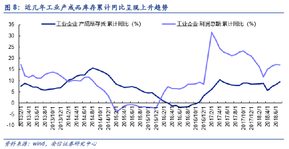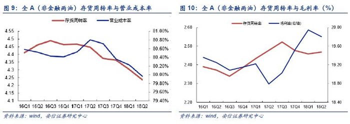 从近两年的数据来看,存货确实抬高了毛利率,进而使得全A的ROE获得提升。具体而言,毛利率受营业成本率影响反向变动,与存货周转率的相关性为-0.87,从13Q1的17.34%经历上涨、稳定、又上涨至18Q2的19.97%,说明存货周转率确实有助于抬高毛利率。从ROE的角度来看,全A(非金融两油)的存货周转率变动趋势在17年之前与ROE一致(相关性为0.65),从13Q1的3.00下降至16Q3的2.34,说明在此之前存货对于ROE的负面作用较为明显;但近2017Q3开始,两者呈现反向变动,存货周转率小幅下滑的同时ROE一路攀升,主要原因是受存货规模经济的影响,营业成本率与存货周转率同趋势变动(相关性为0.91)开始下降,从16Q4的25.19%大幅下降至18Q2的15.61%。这点也可以从近年来工业产成品存货累计同比增速和工业企业利润总额累计同比增速的相关性间得到验证。
