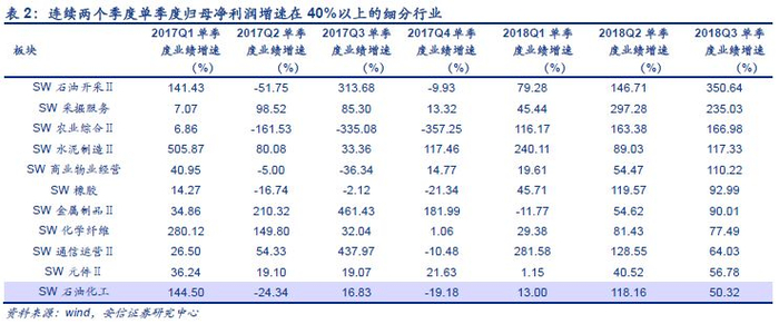 从二级行业来看,2018Q3单季度归母净利润增速前五的分别为:林业Ⅱ(+367.40%)、石油开采Ⅱ(+ 350.64%)、采掘服务(+ 235.03%)、种植业(+ 222.86%)、农业综合Ⅱ(+166.98%)。后五的分别为:船舶制造Ⅱ(-1298.16%)、专业零售(-86.48%)、光学光电子(-52.37%)、园林工程Ⅱ(-52.15%)、证券Ⅱ(-51.32%)。